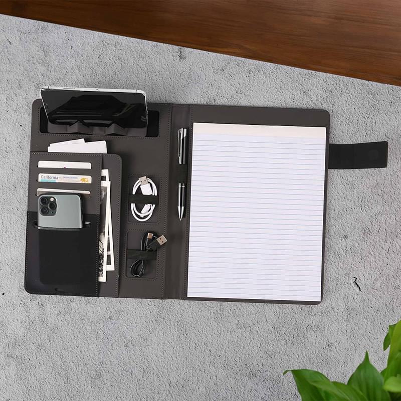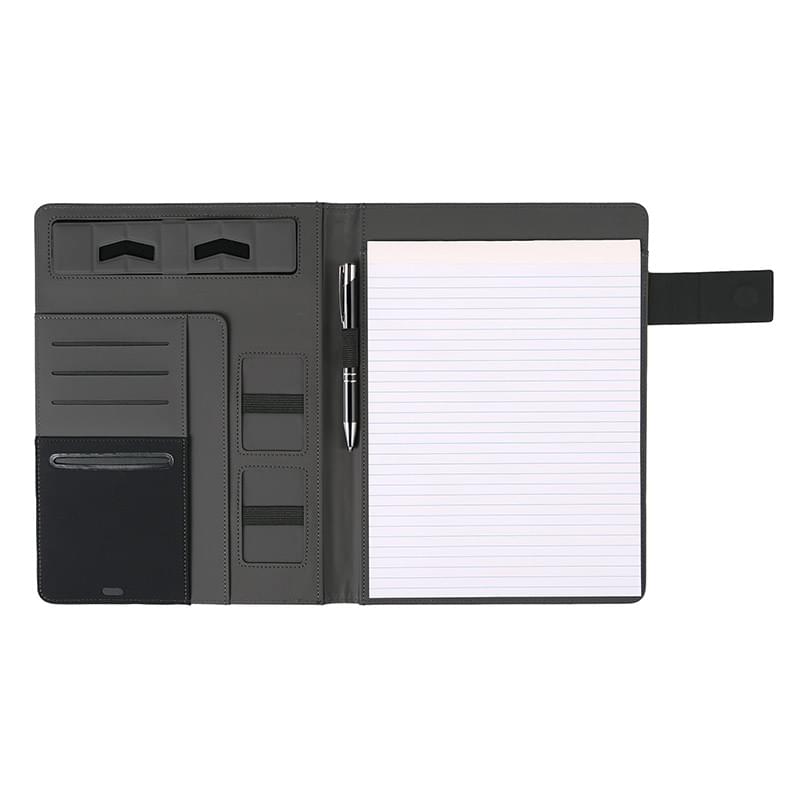 Enhance your professional presence with the Magnus Padfolio. A sleek organizer integrating tech and note-taking essentials. Features include a collapsible phone/tablet stand, 3 card slots, a dedicated phone pocket, 2 elastic loops, 2 slash pockets, and a pen loop. The front magnet closure secures belongings and serves as an extra pen loop. With a lined paper pad and Sonota™ Glass pen included, it's your stylish ally for meetings and on-the-go organization.