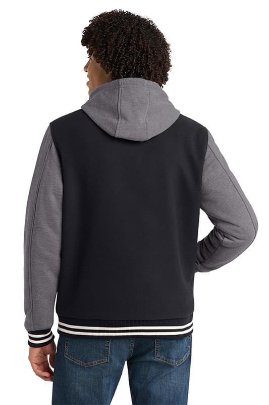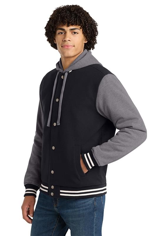 We took the old-school letterman jacket and reworked it in comfortable wool-like polyester with a warm quilted lining. A detachable hood adds versatility. | 10.6-ounce, 94/4/2 poly/rayon/spandex body 9-ounce, 60/40 cotton/poly sleeves and hood 100% polyester quilted lining with 2-ounce, 100% polyester fill in body and sleeve Detachable three-panel hood with dyed-to-match drawcord Interior pocket Rib knit collar, cuffs and hem 2x2 snap front closure Front slash pockets Decoration access pocket * Please note: This product is transitioning from woven labels to tag-free labels. Your order may contain a combination of both labels