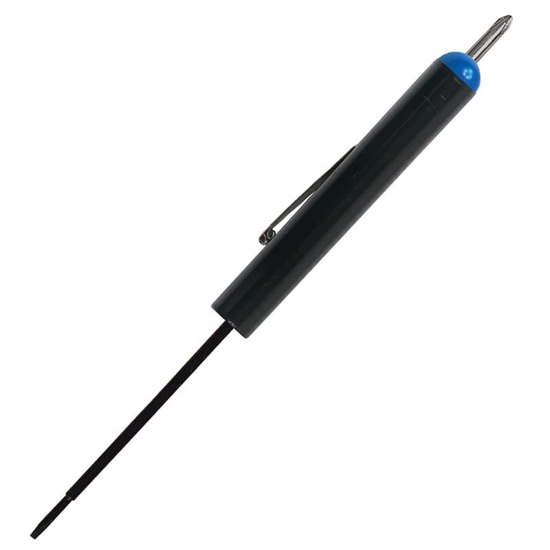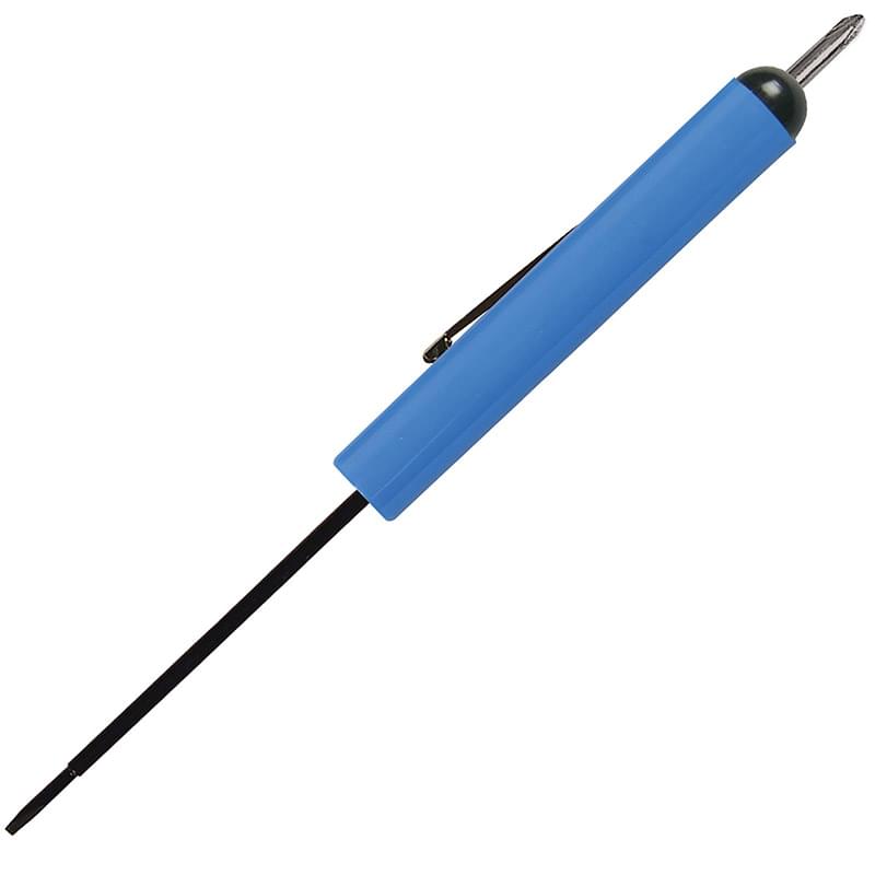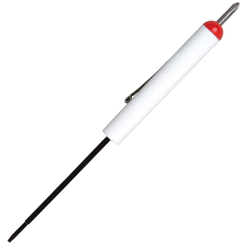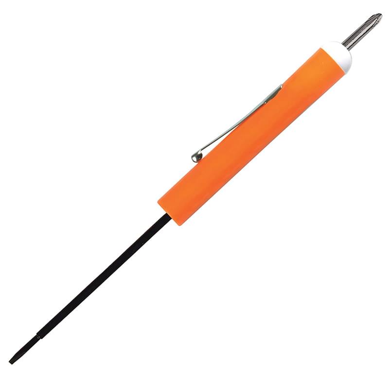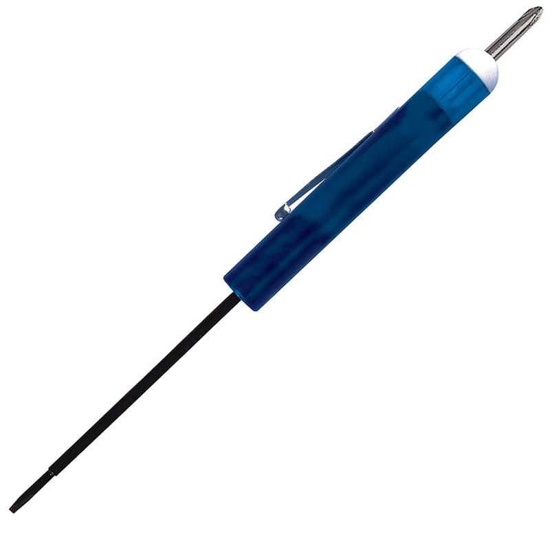 Pocket screwdrivers are appreciated and used by everyone and when was the last time you threw away a tool? Keep your message in your customer's hands with Fey Promo Tools! #0 Phillips top is standard. #1 Larger Phillips is now available (Must specify on order). Fixed 2.5mm Tech Blade. Optional Plastic safety tip available. Metal pocket clip. Tool quality tempered steel blades. Molded, assembled and imprinted in USA. Please specify Button/Top color on order.
