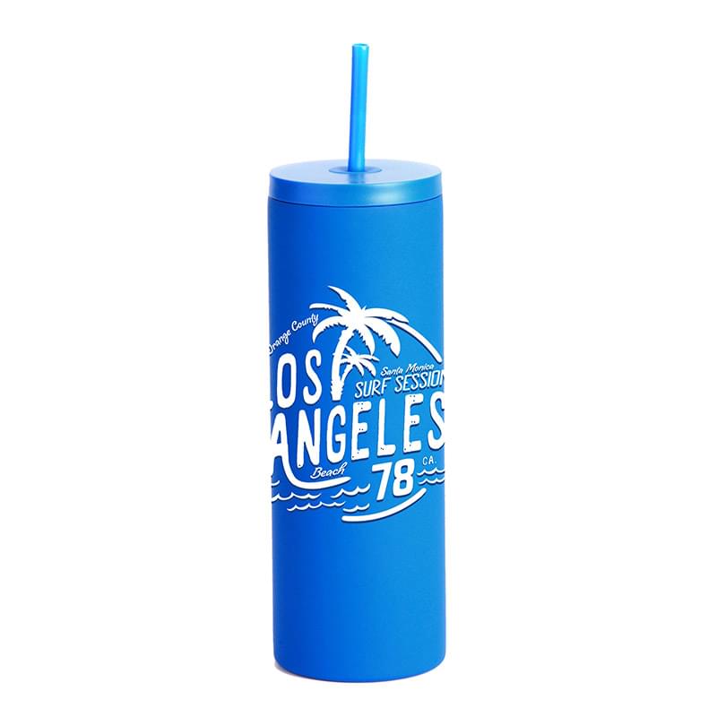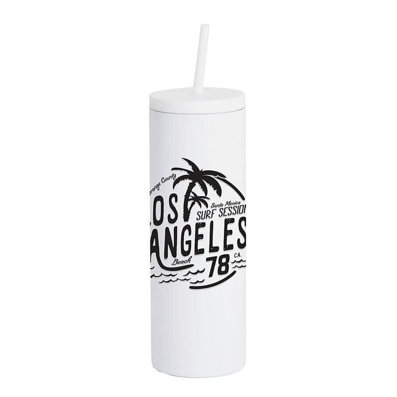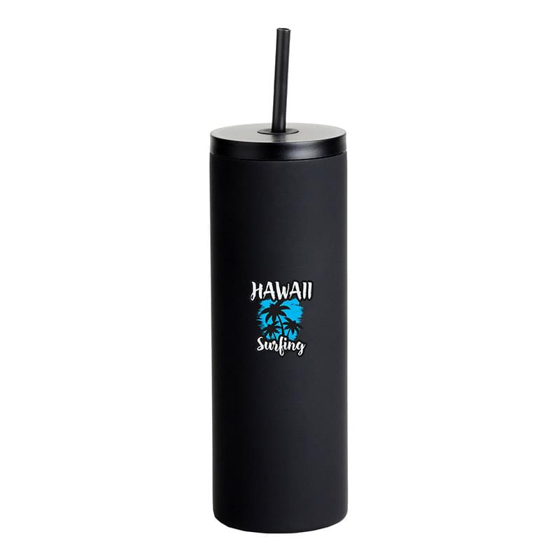 The sleek, skinny design might be one of the first things noticed about this tumbler, but it also has double wall stainless steel insulation, a spill reduction straw and comfortable rubberized finish. The matching lid and silicone straw complete the look. The narrow design of this 20 oz tumbler easily fits in standard cup holders and fits well in the hand. The double wall construction maintains the temperature of the contents so the last sip tastes as good as the first.